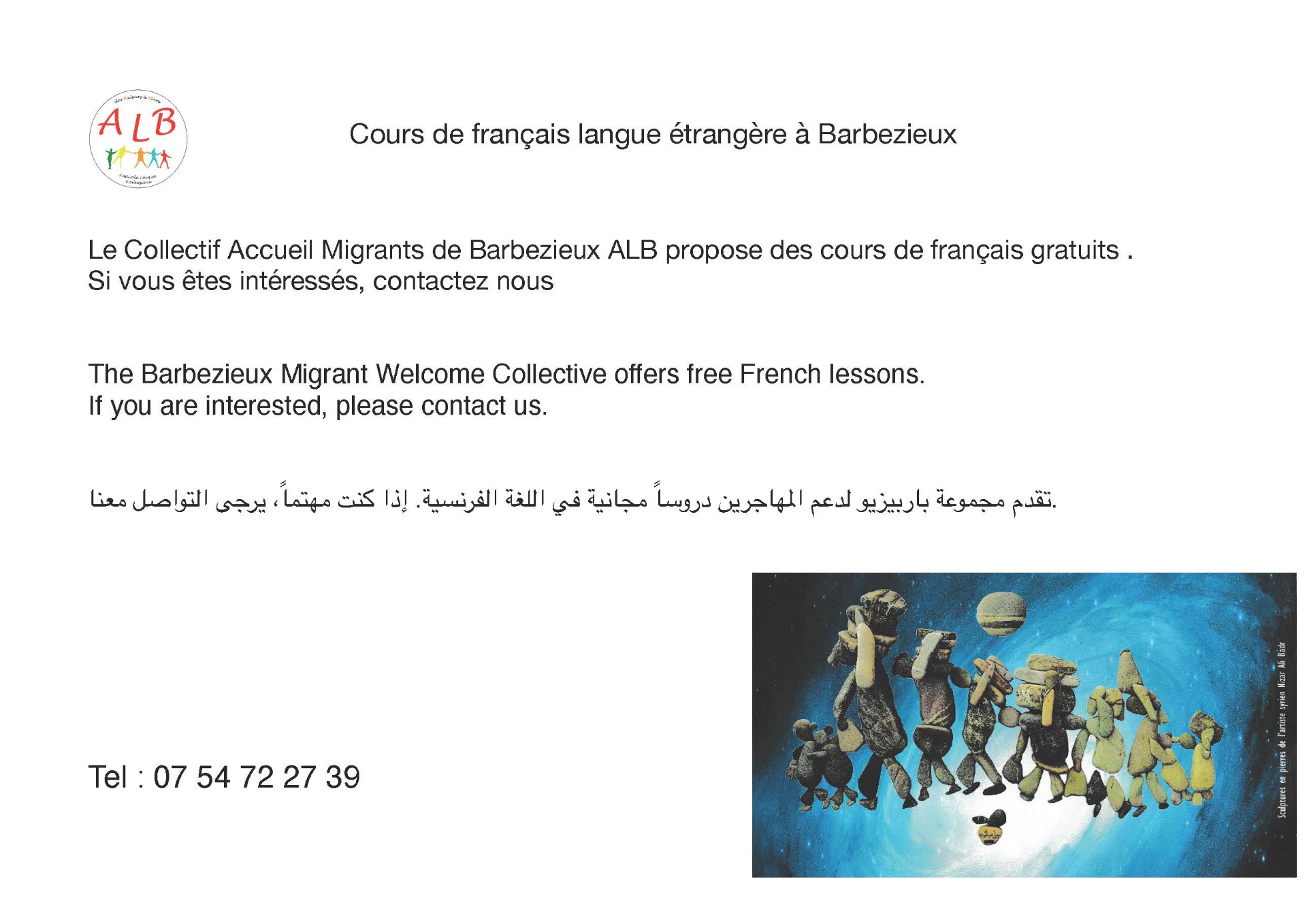 Le Collectif Accueil Migrants Barbezieux a été créé en septembre 2015 et rassemble aujourd'hui une soixantaine d'hommes et de femmes qui ont souhaité se regrouper pour apporter collectivement des réponses concrètes à la détresse de personnes migrantes arrivées en Charente, à ces hommes, femmes et enfants qui souvent au péril de leur vie décident de tout quitter pour chercher asile dans un pays en paix.